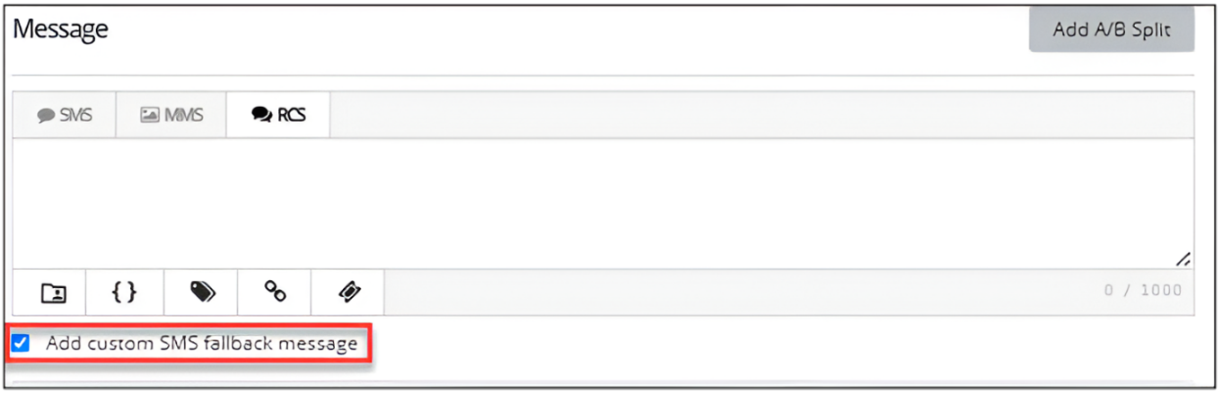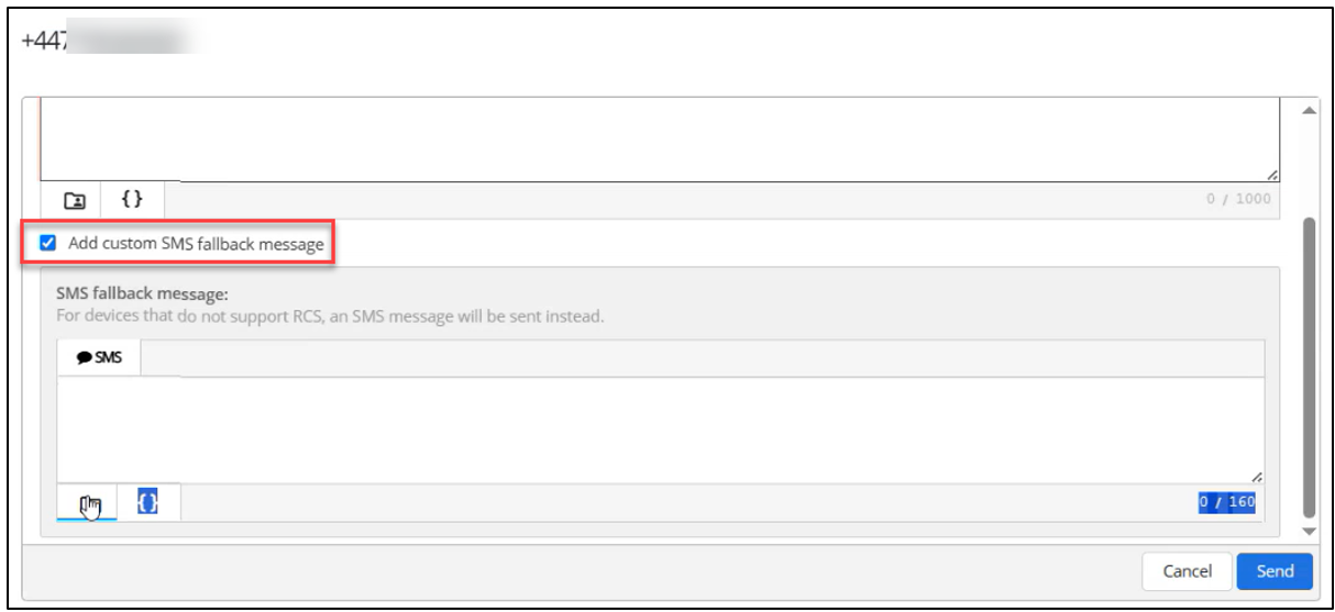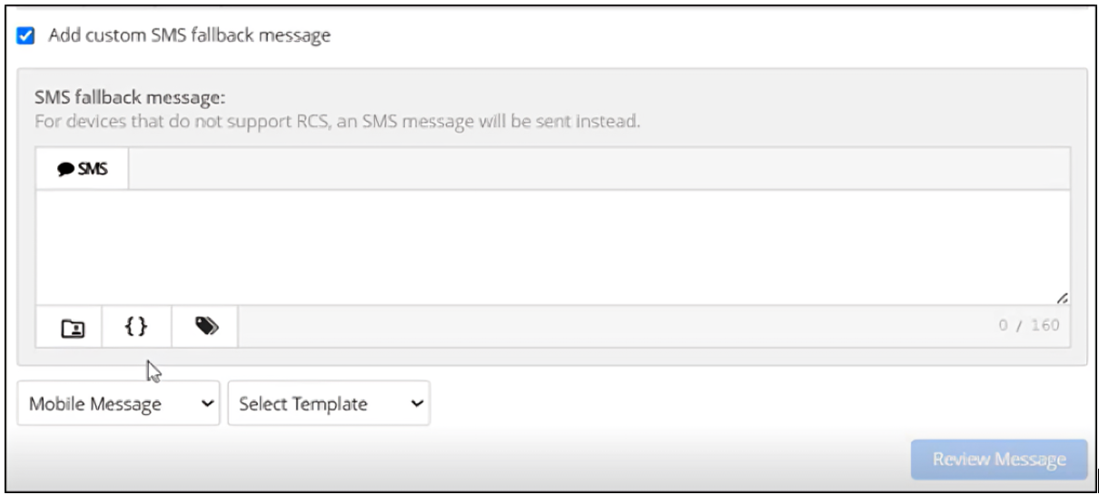 Note: The customizations that are available for the SMS message component will be automatically available for an RCS and SMS fallback message. If “Add custom SMS fallback message” is not selected, the SMS fallback will be disabled. In this case, if no fallback message is provided and the recipient’s device does not support RCS, the message will not be delivered.