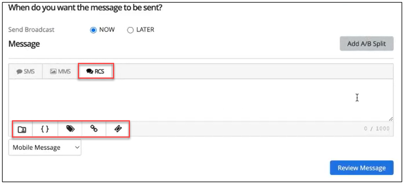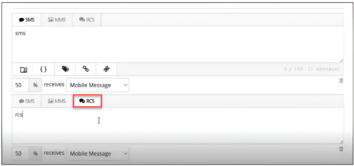 Note: You can only send RCS messages after completing the Google RCS agent approval process. If your RCS agent is not approved, the RCS option will be disabled or unavailable during message composition. Only verified and approved brands are allowed to send RCS messages.