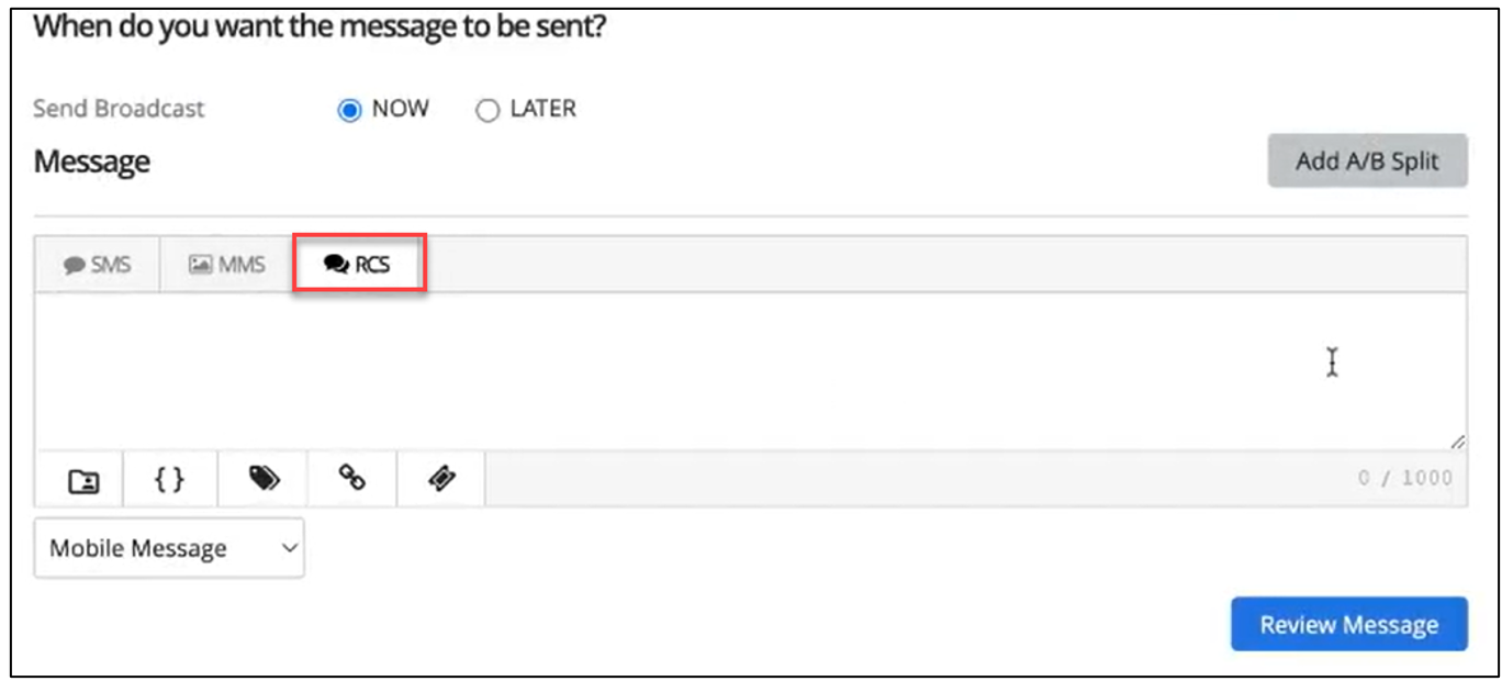 Once RCS is enabled for your account, short code, role, and originator, the option to compose and send RCS messages becomes available.