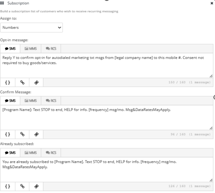 • Confirm message: Compliance message sent in addition to the opt-in message.