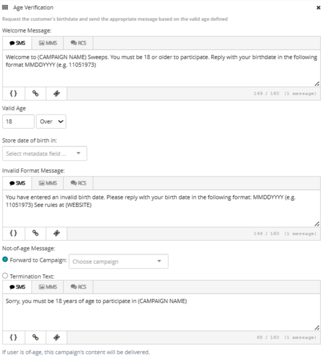 If your campaign has an age requirement, for example, if a subscriber must be 18 or older to participate in a sweepstakes, use the Age Verification component to collect the subscriber's date of birth to determine their age. Depending on their response, the mobile user will either be allowed to proceed with the campaign or will be excluded from the campaign.