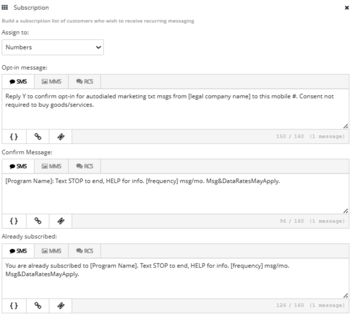 The Subscription component is an essential element of every campaign, because it adds the opt-in messaging for new subscribers. For more information about compliant messaging, see Opt-in messages.
