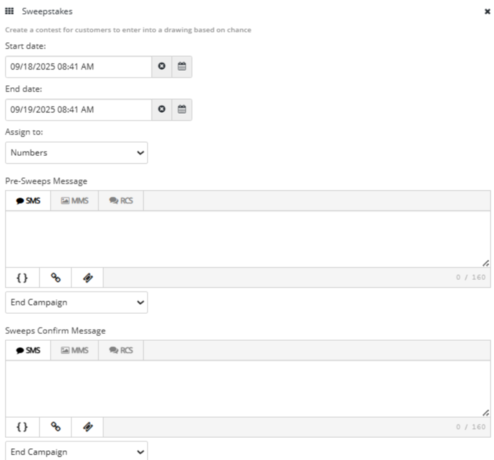 • Post-Sweeps message for users who text the keyword after the end date, informing them that the contest has ended.