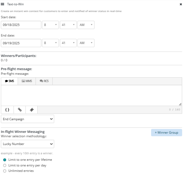 Note: In a text-to-win contest, winners are selected during the course of the contest; in a sweepstakes contest, the prize is awarded after the contest ends. For more information, see Sweepstakes and Managing sweepstakes contests.