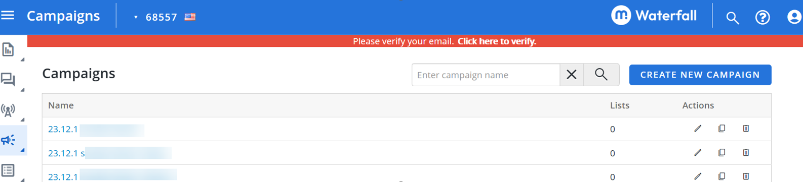 When you sign in to Waterfall, you see the Campaigns table, which lists the campaigns that have been set up for your account.